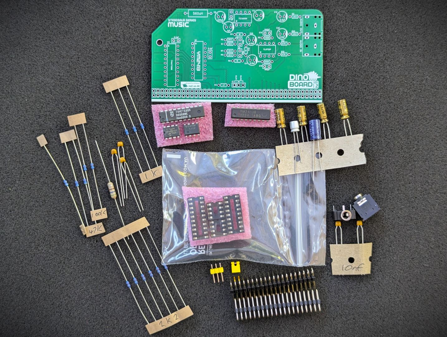 This base kit includes the usual main components (PCB, capacitors, IC sockets, connectors, and the ICs)
